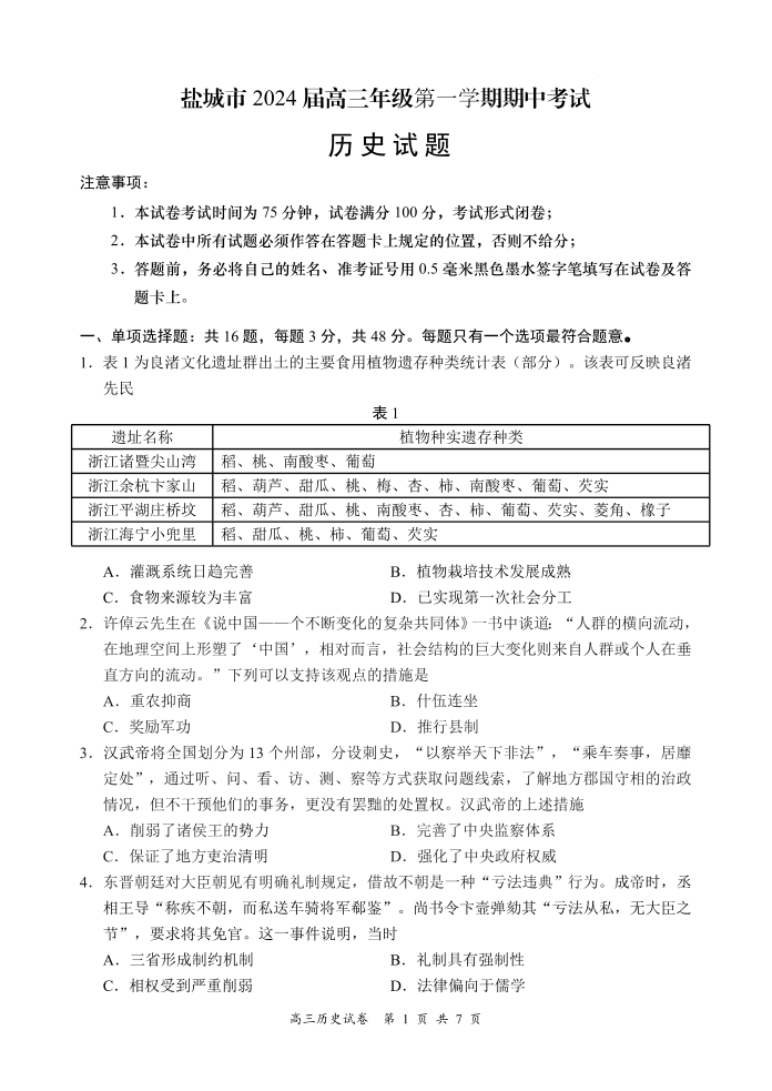 江苏省盐城市2024届高三上学期期中考试历史+答案