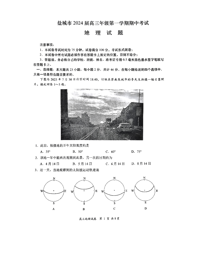 江苏省盐城市2024届高三上学期期中考试地理+答案