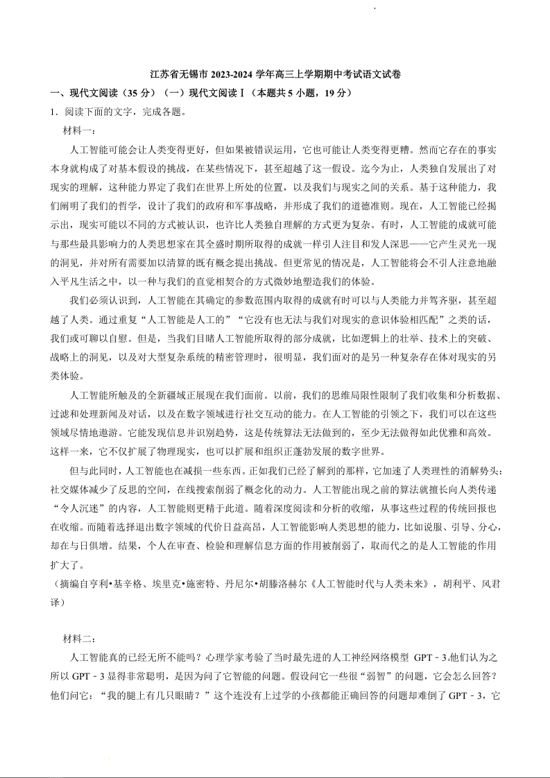 江苏省无锡市2024届高三上学期期中教学质量调研测试语文+答案