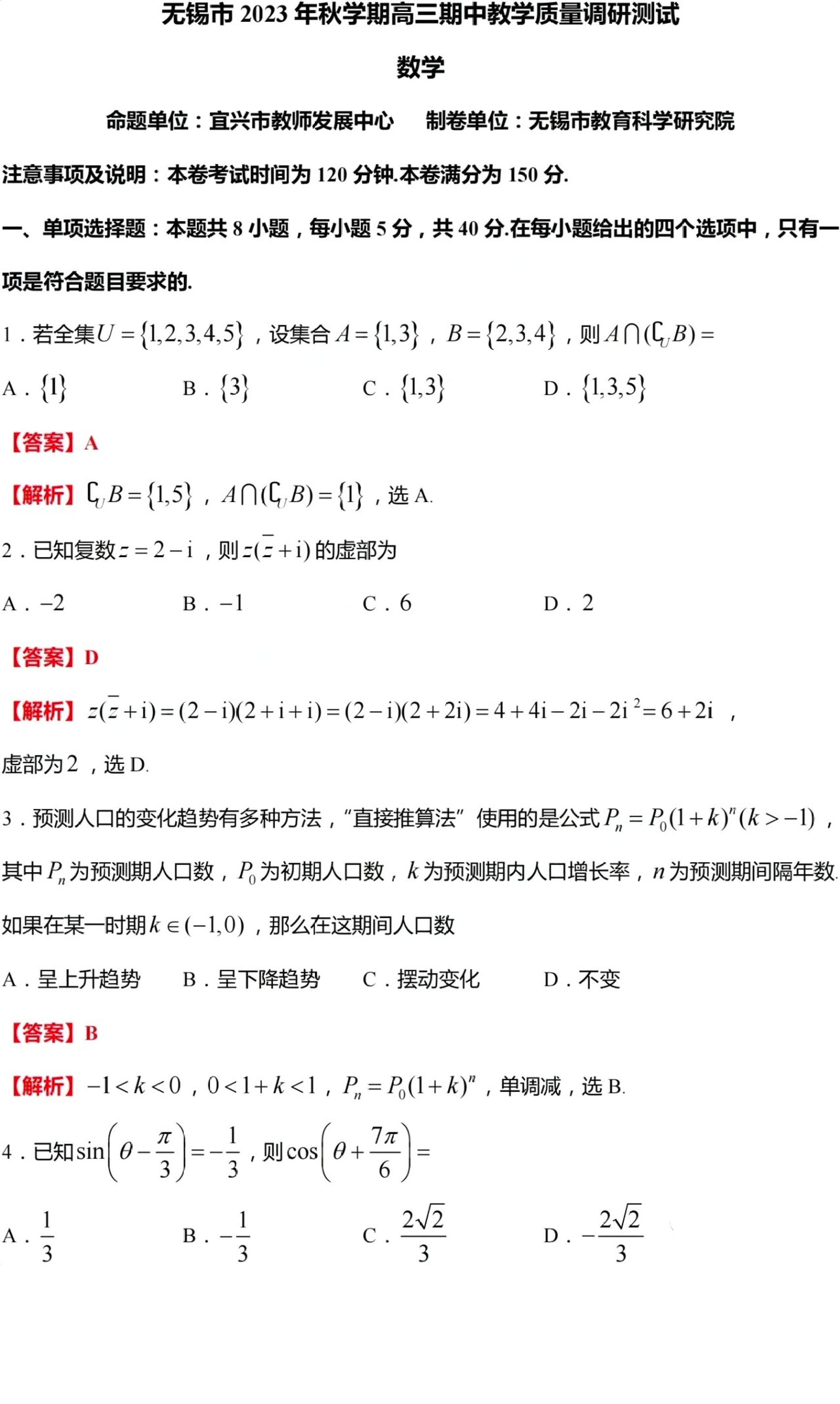 江苏省无锡市2024届高三上学期期中教学质量调研测试数学(解析版)