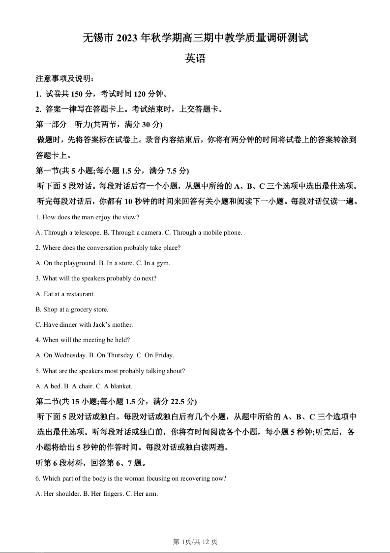 江苏省无锡市2024届高三上学期期中教学质量调研测试英语(原卷版)