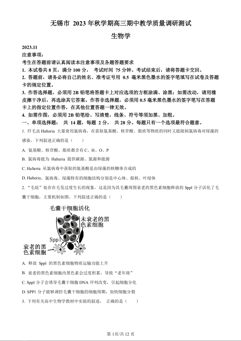 江苏省无锡市2024届高三上学期期中教学质量调研测试生物(原卷版)