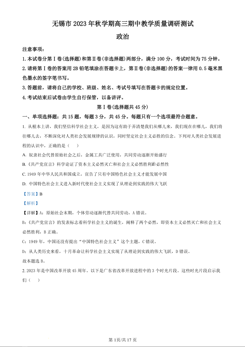 江苏省无锡市2024届高三上学期期中教学质量调研测试政治(精品解析版)