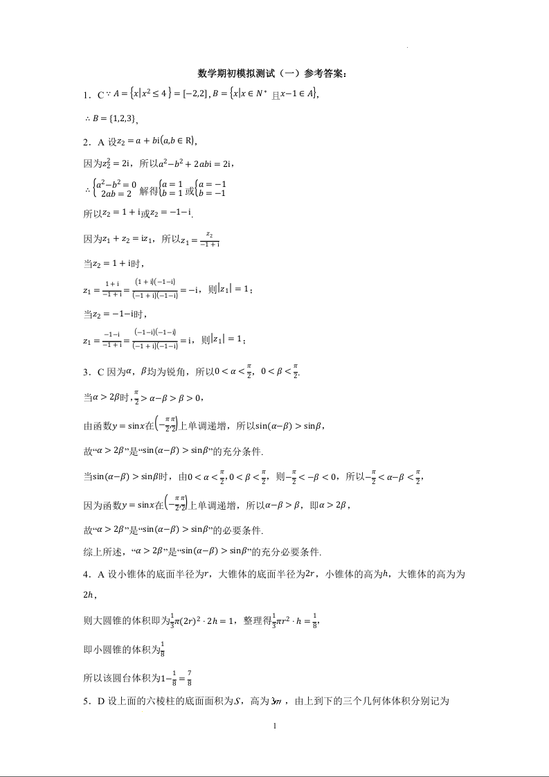 江苏省徐州市沛县2024届高三上学期期初模拟考(一)数学答案