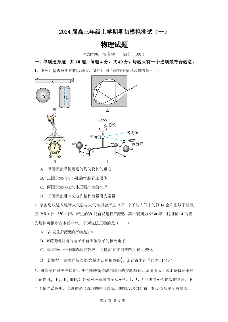 江苏省徐州市沛县2024届高三上学期期初模拟考(一)物理