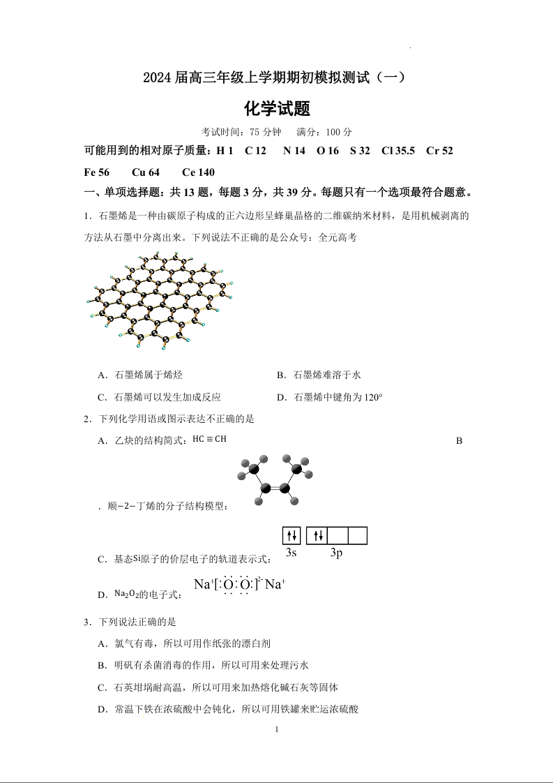江苏省徐州市沛县2024届高三上学期期初模拟考(一)化学