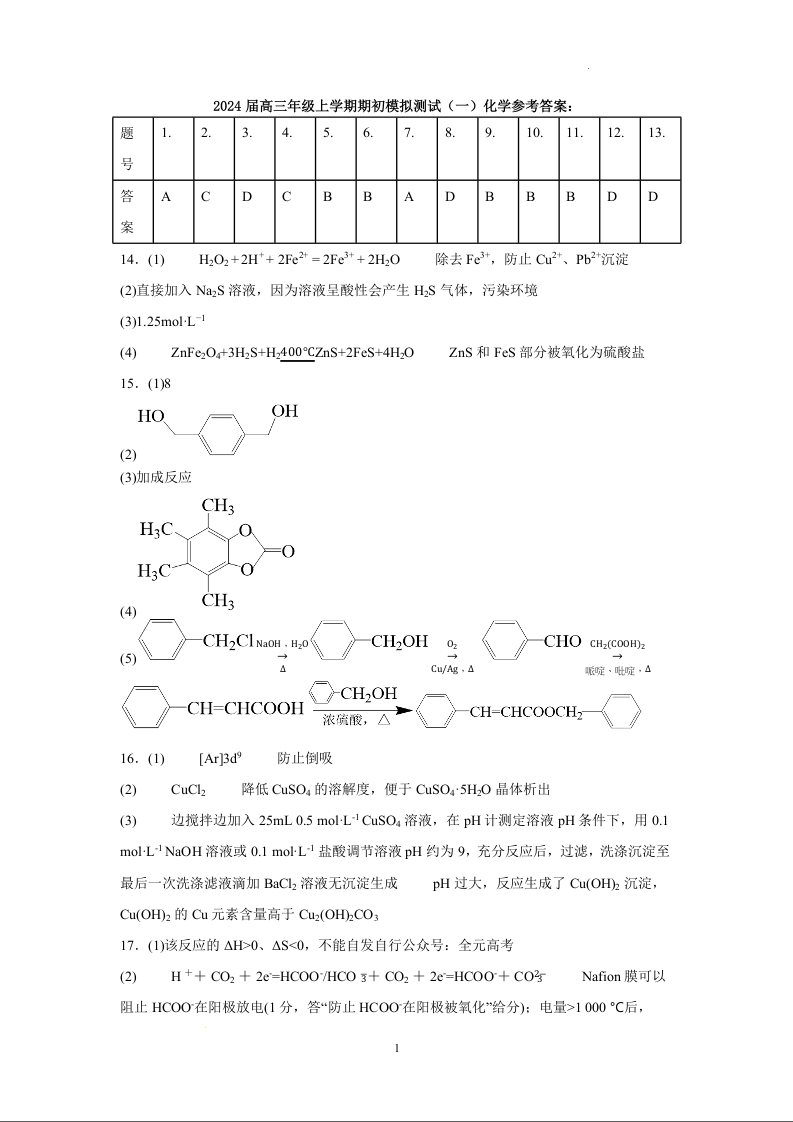 江苏省徐州市沛县2024届高三上学期期初模拟考(一)化学答案
