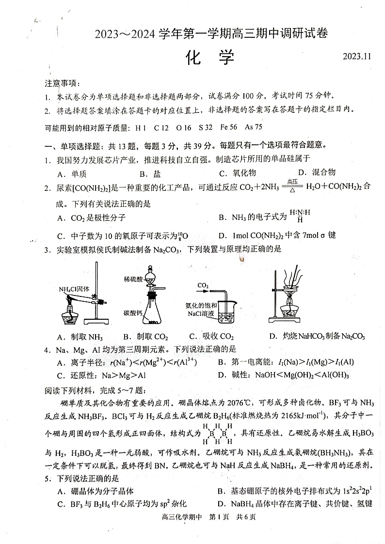 江苏省苏州市2024届高三上学期期中调研考试化学