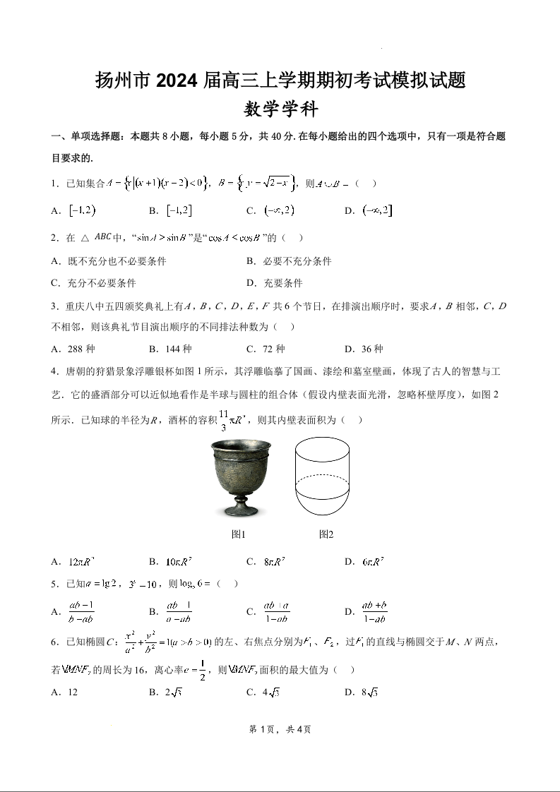 江苏省扬州市2024届高三上学期期初考试模拟数学