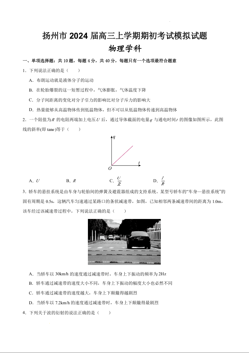 江苏省扬州市2024届高三上学期期初考试模拟物理
