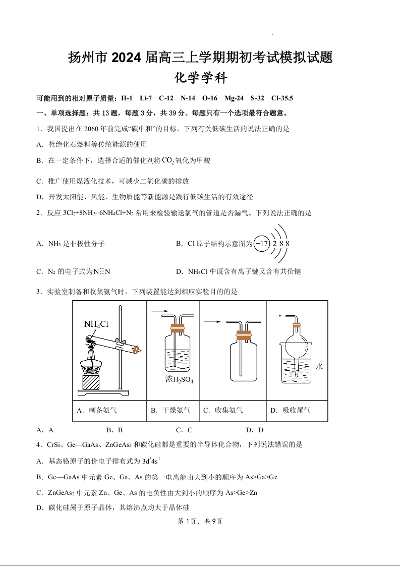 江苏省扬州市2024届高三上学期期初考试模拟化学