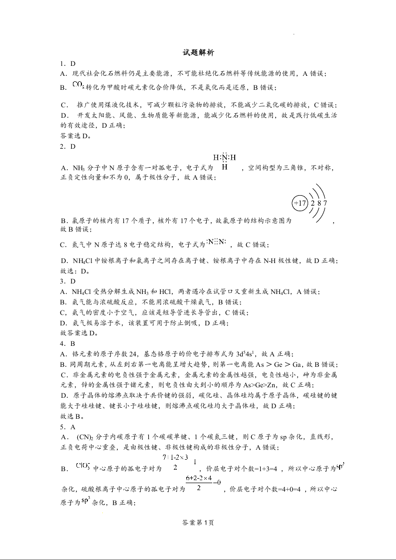 江苏省扬州市2024届高三上学期期初考试模拟化学答案