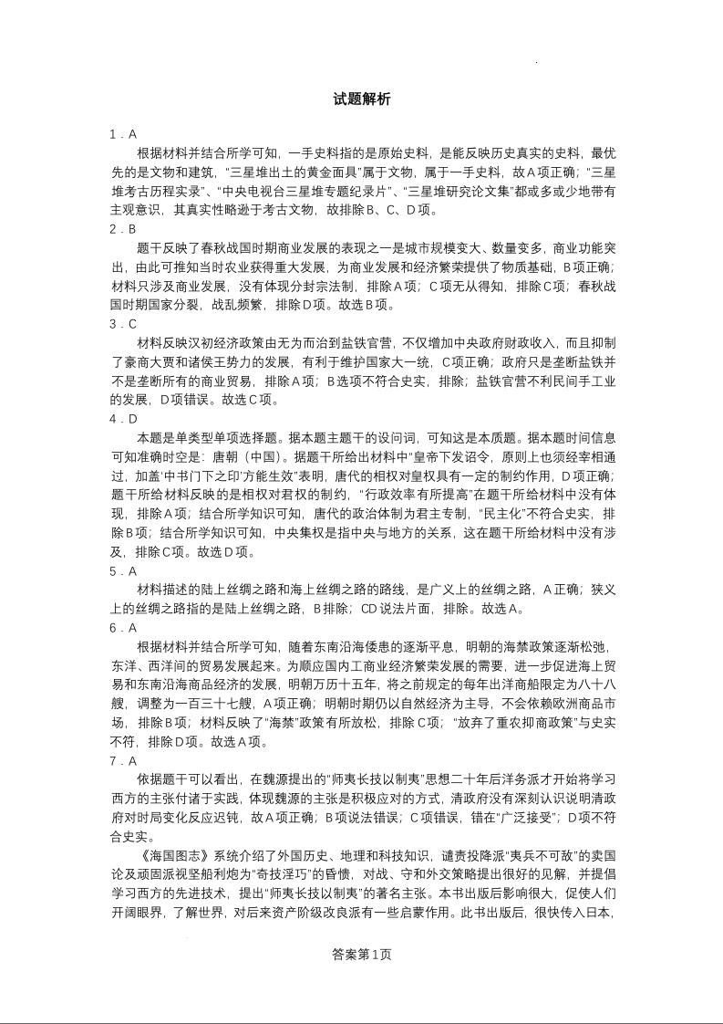江苏省扬州市2024届高三上学期期初考试模拟历史答案