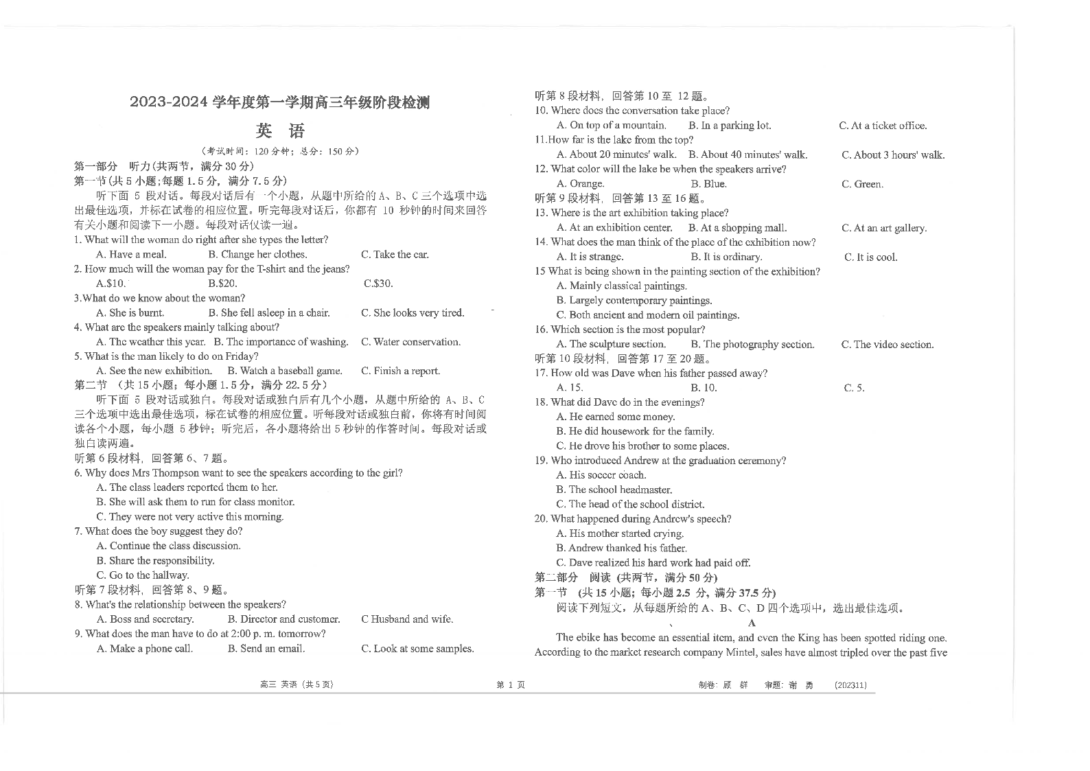 江苏省南通市海安市2024届高三上学期11月期中考试英语+答案