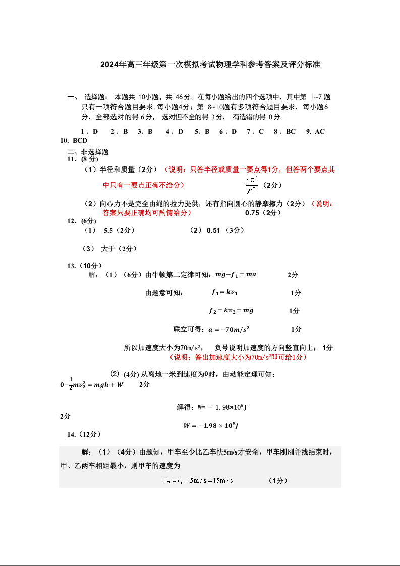 吉林省吉林市2024届高三上学期第一次模拟考试物理答案