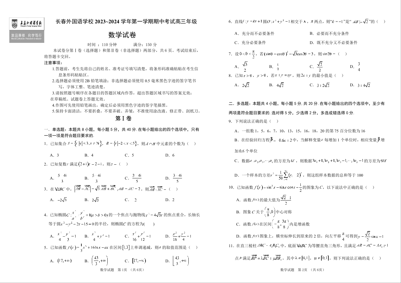 吉林省长春市外国语学校2024届高三上学期期中考试数学