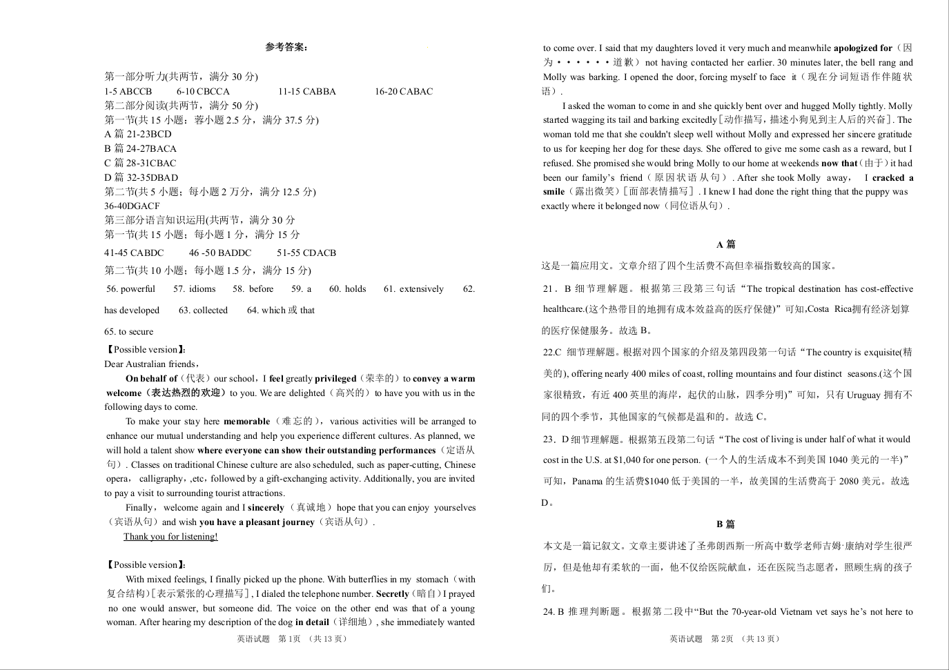 吉林省长春市外国语学校2024届高三上学期期中考试英语答案
