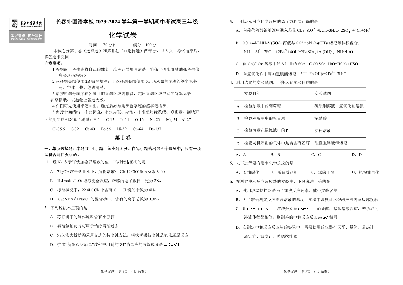 吉林省长春市外国语学校2024届高三上学期期中考试化学