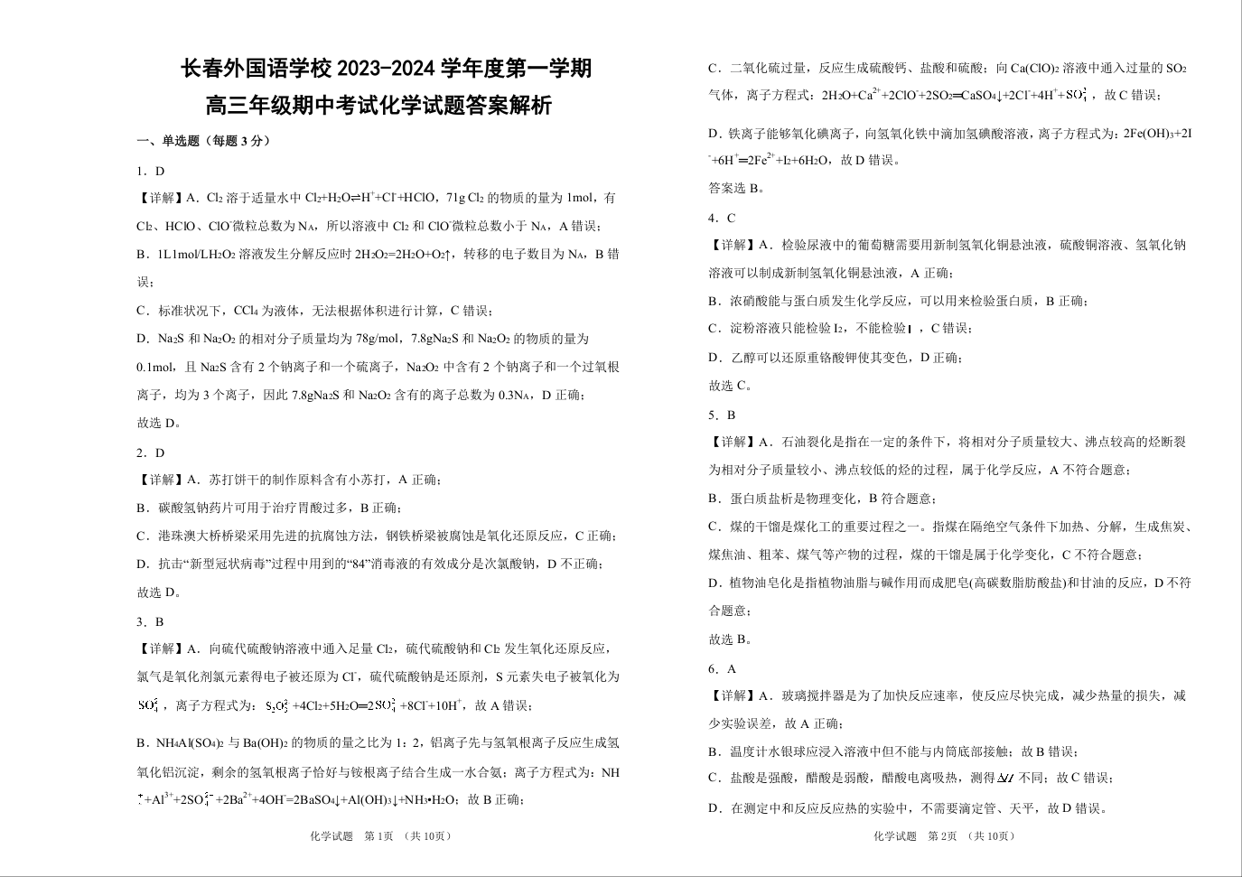 吉林省长春市外国语学校2024届高三上学期期中考试化学答案