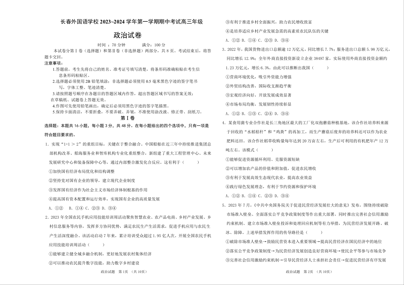 吉林省长春市外国语学校2024届高三上学期期中考试政治+答案