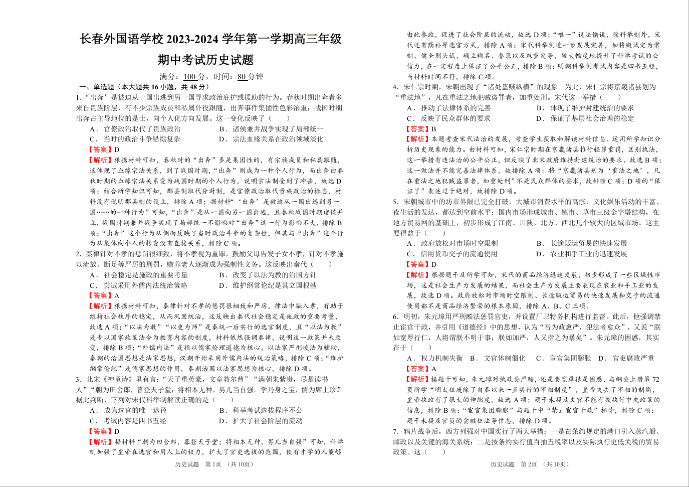 吉林省长春市外国语学校2024届高三上学期期中考试历史答案