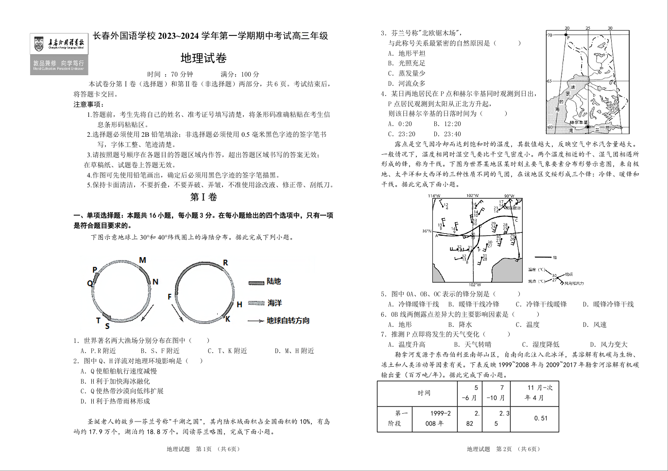 吉林省长春市外国语学校2024届高三上学期期中考试地理