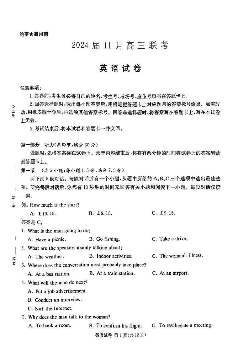 湖南省湘东九校2024届高三11月联考英语