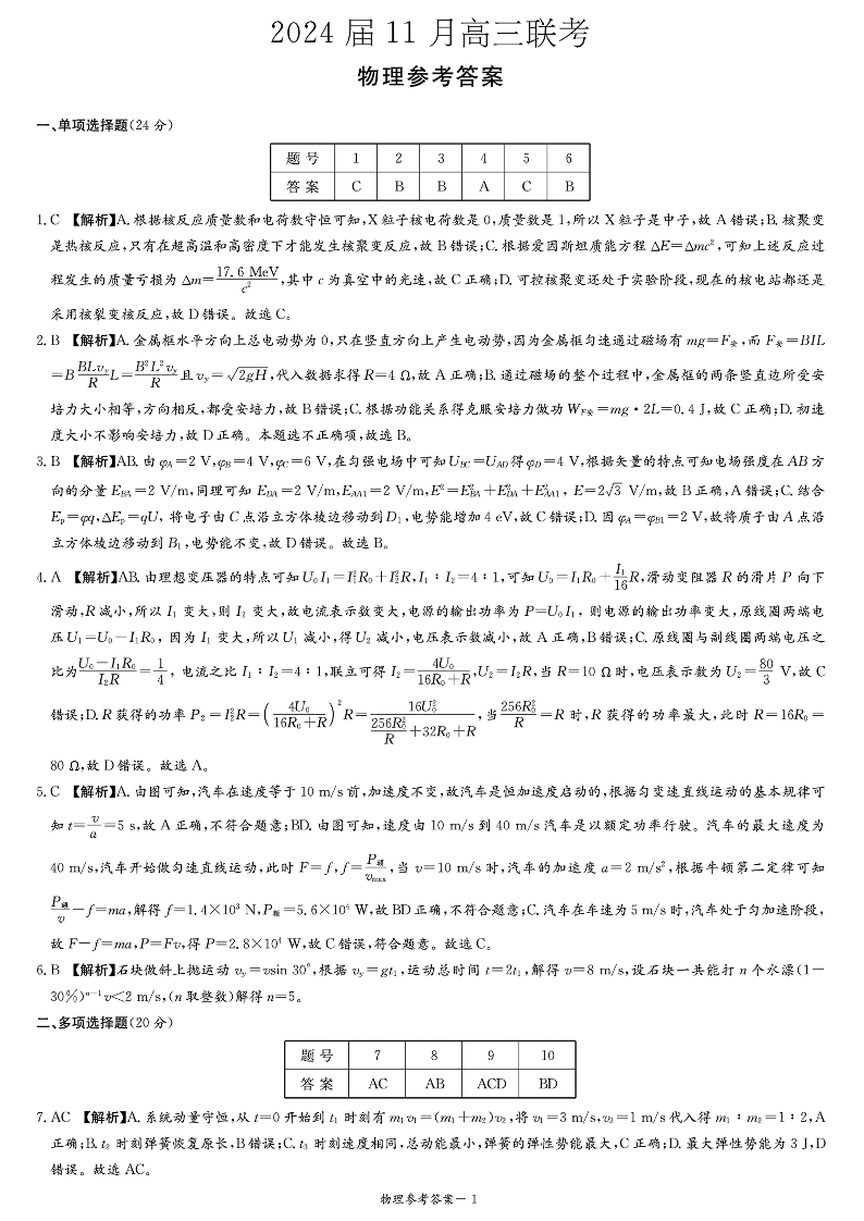 湖南省湘东九校2024届高三11月联考物理答案