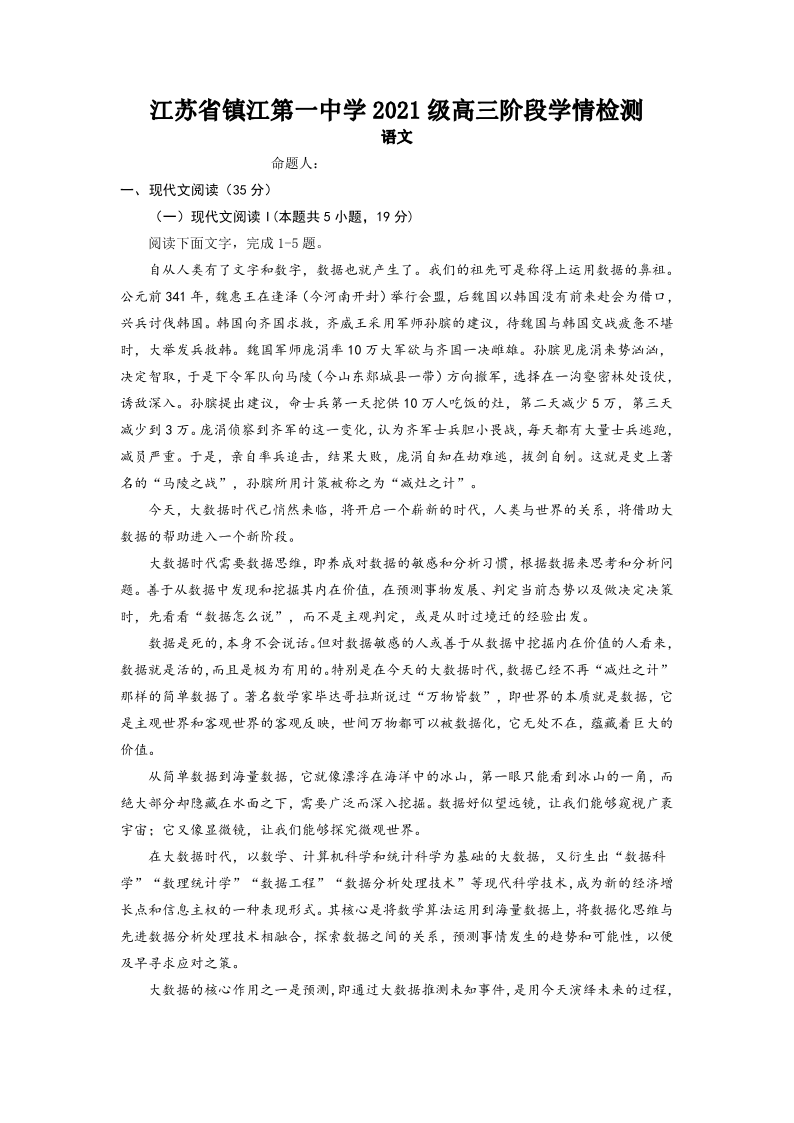 江苏省镇江第一中学2024届高三上学期期初阶段考语文