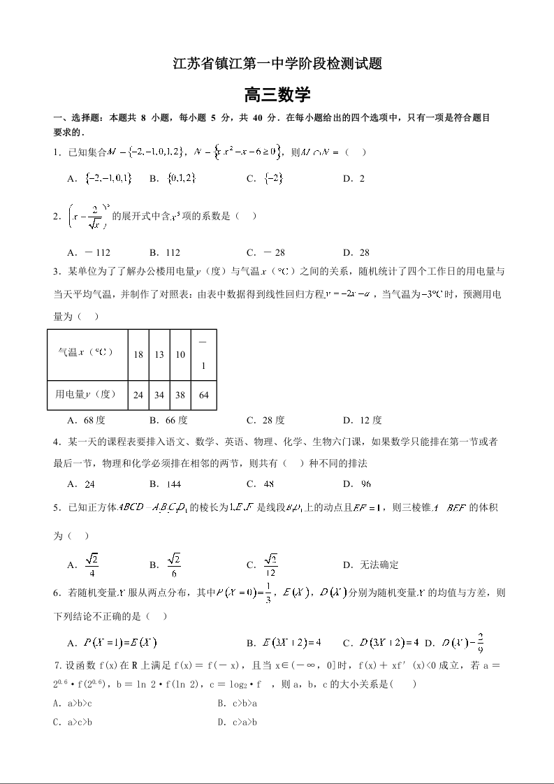 江苏省镇江第一中学2024届高三上学期期初阶段考数学