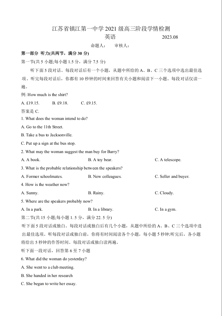 江苏省镇江第一中学2024届高三上学期期初阶段考英语