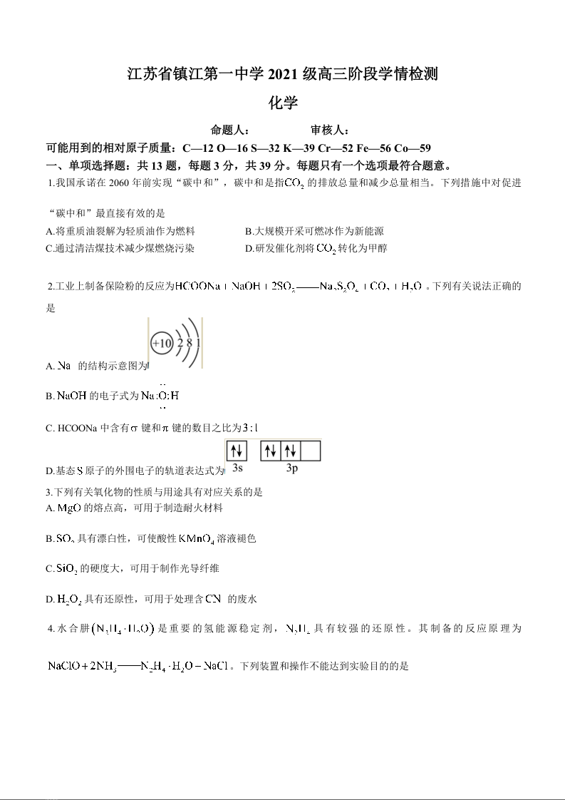 江苏省镇江第一中学2024届高三上学期期初阶段考化学+答案