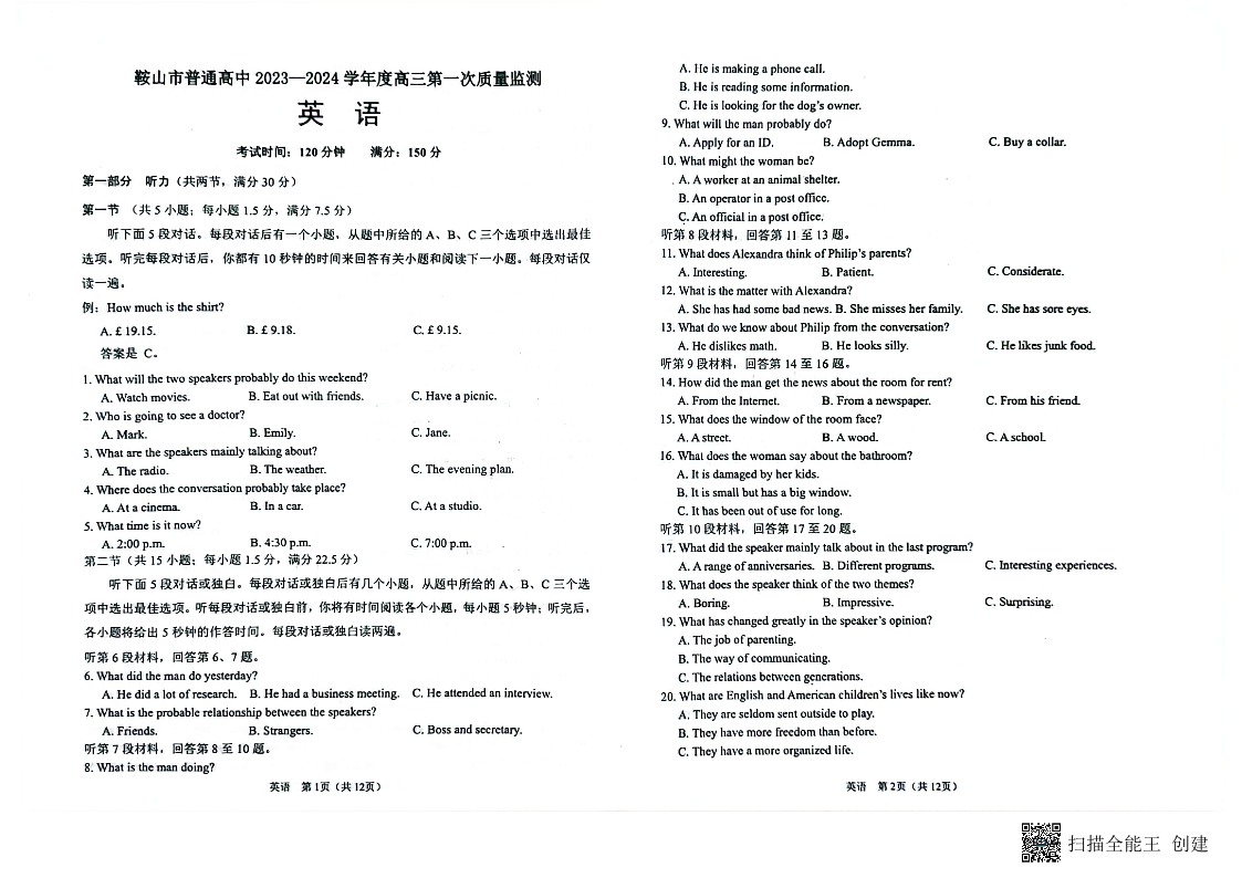 辽宁省鞍山市2024届高三上学期第一次质量监测英语