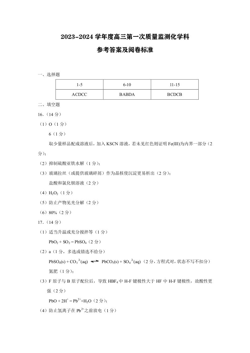 辽宁省鞍山市2024届高三上学期第一次质量监测化学答案
