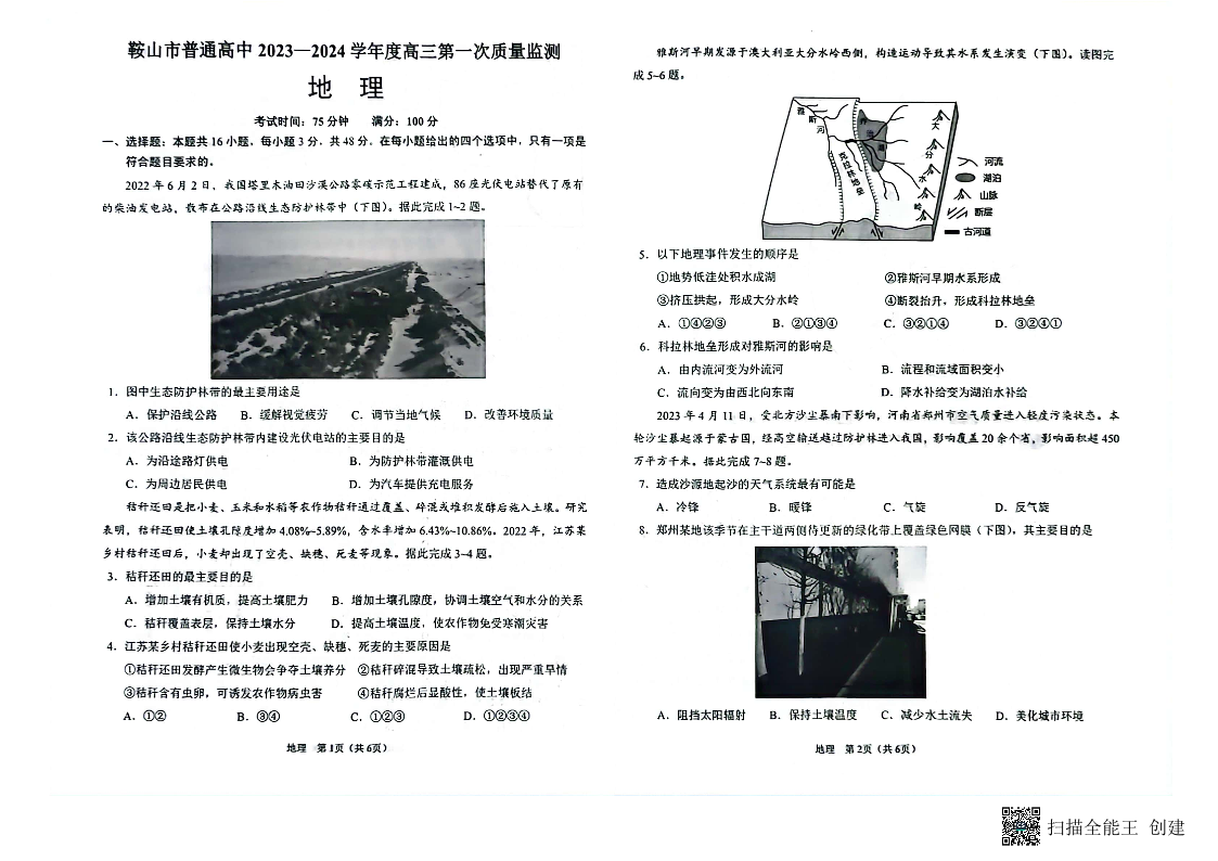 辽宁省鞍山市2024届高三上学期第一次质量监测地理