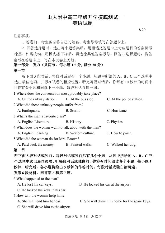 山东省菏泽市定陶区明德学校(山大附中实验学校)2024届高三上学期开学考英语+答案