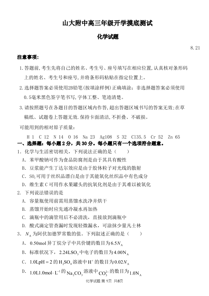 山东省菏泽市定陶区明德学校(山大附中实验学校)2024届高三上学期开学考化学+答案