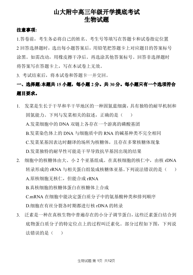 山东省菏泽市定陶区明德学校(山大附中实验学校)2024届高三上学期开学考生物+答案