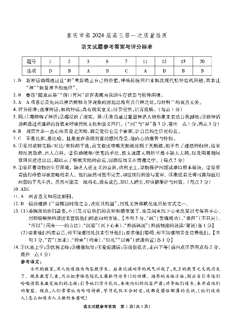 重庆市南开中学高2024届高三第一次质量检测语文答案