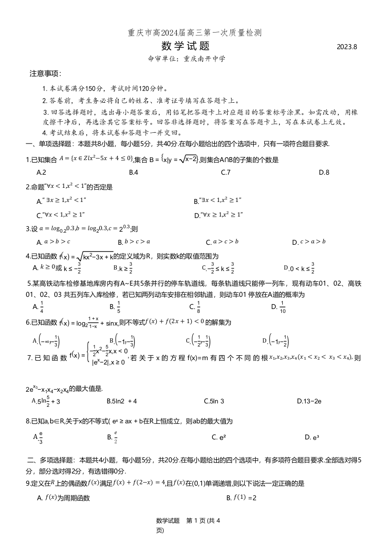 重庆市南开中学高2024届高三第一次质量检测数学