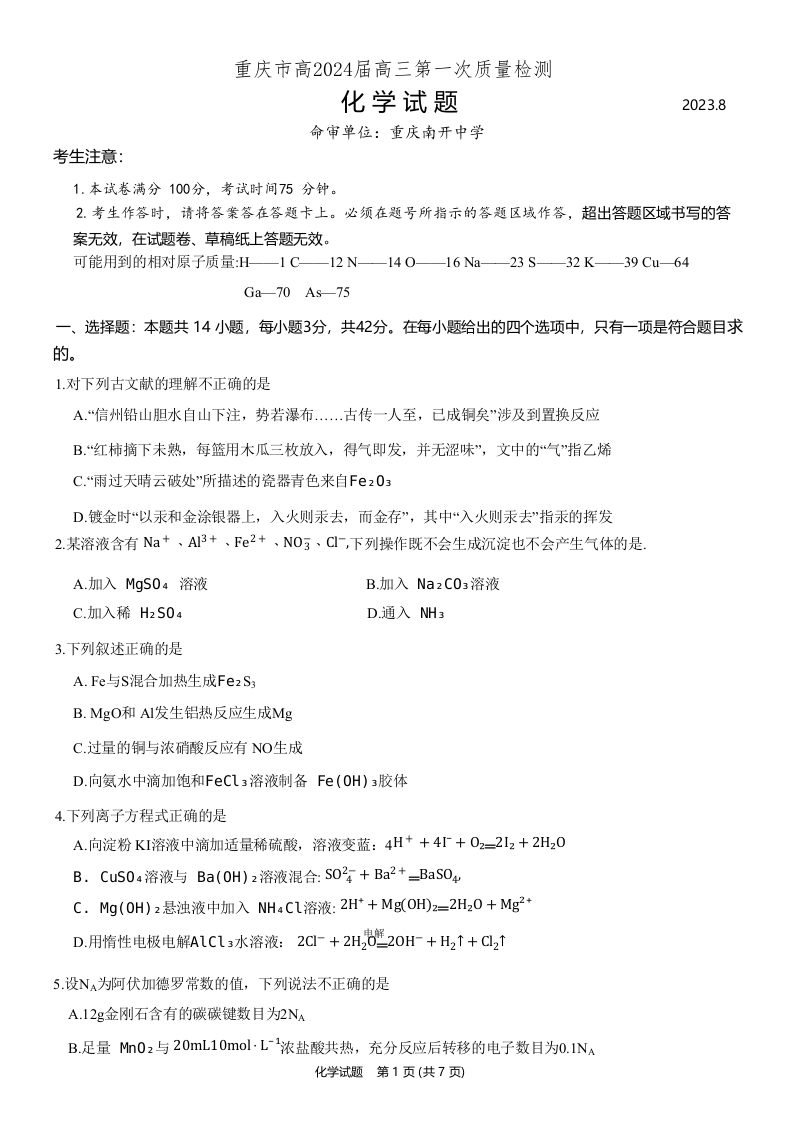 重庆市南开中学高2024届高三第一次质量检测化学