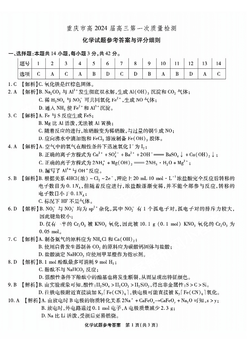 重庆市南开中学高2024届高三第一次质量检测化学答案
