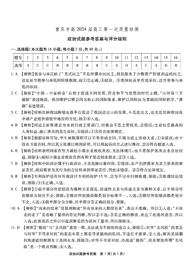 重庆市南开中学高2024届高三第一次质量检测政治答案
