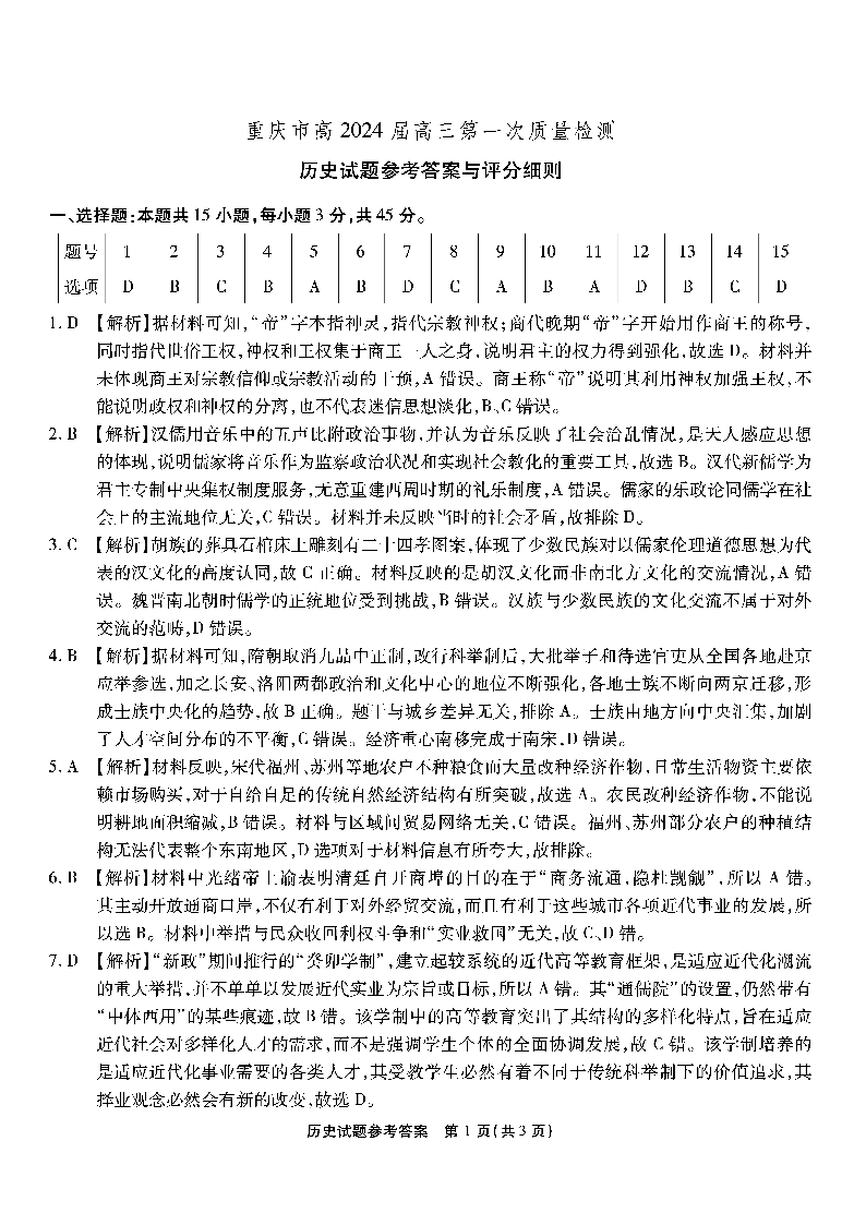 重庆市南开中学高2024届高三第一次质量检测历史答案