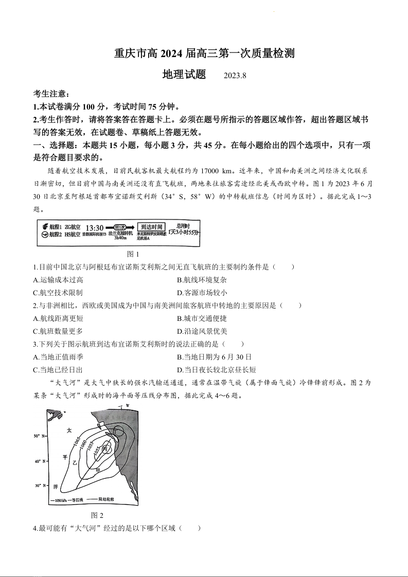 重庆市南开中学高2024届高三第一次质量检测地理+地理