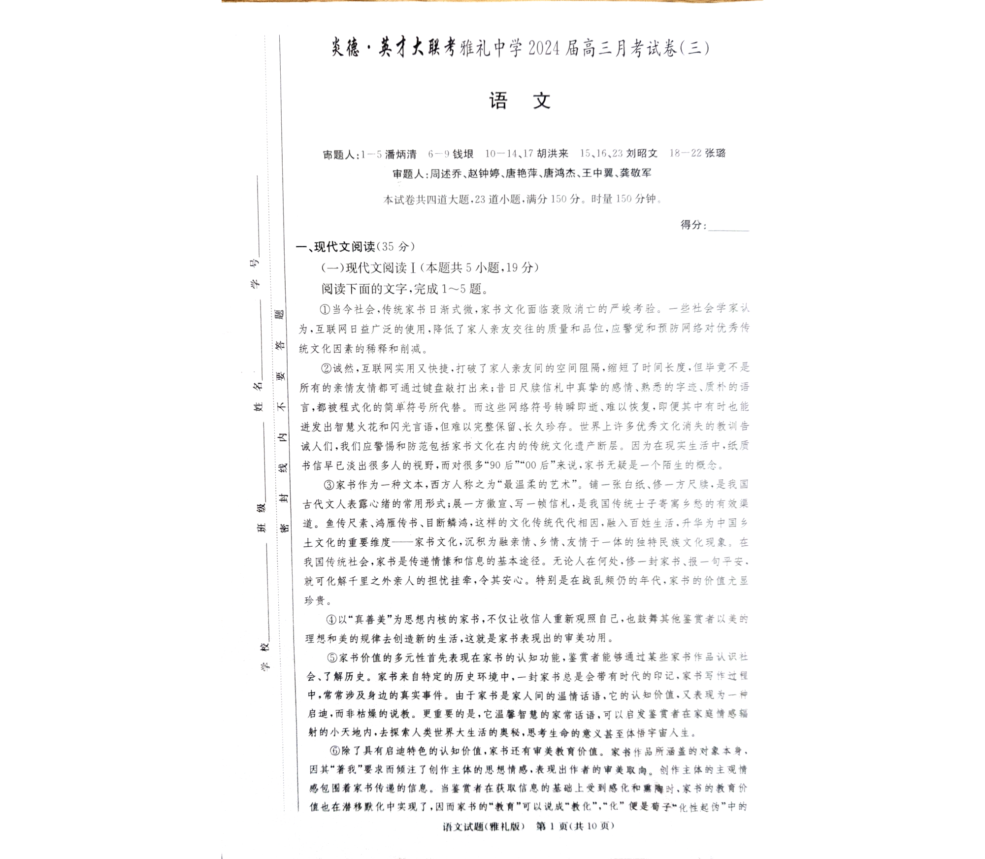 湖南省长沙市雅礼中学2024届高三上学期月考试题(三)语文