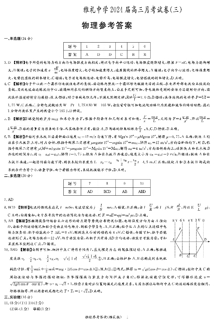 湖南省长沙市雅礼中学2024届高三上学期月考试题(三)物理答案
