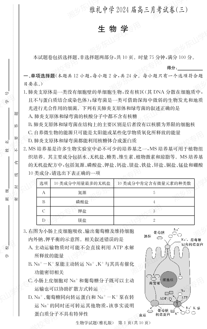 湖南省长沙市雅礼中学2024届高三上学期月考试题(三)生物