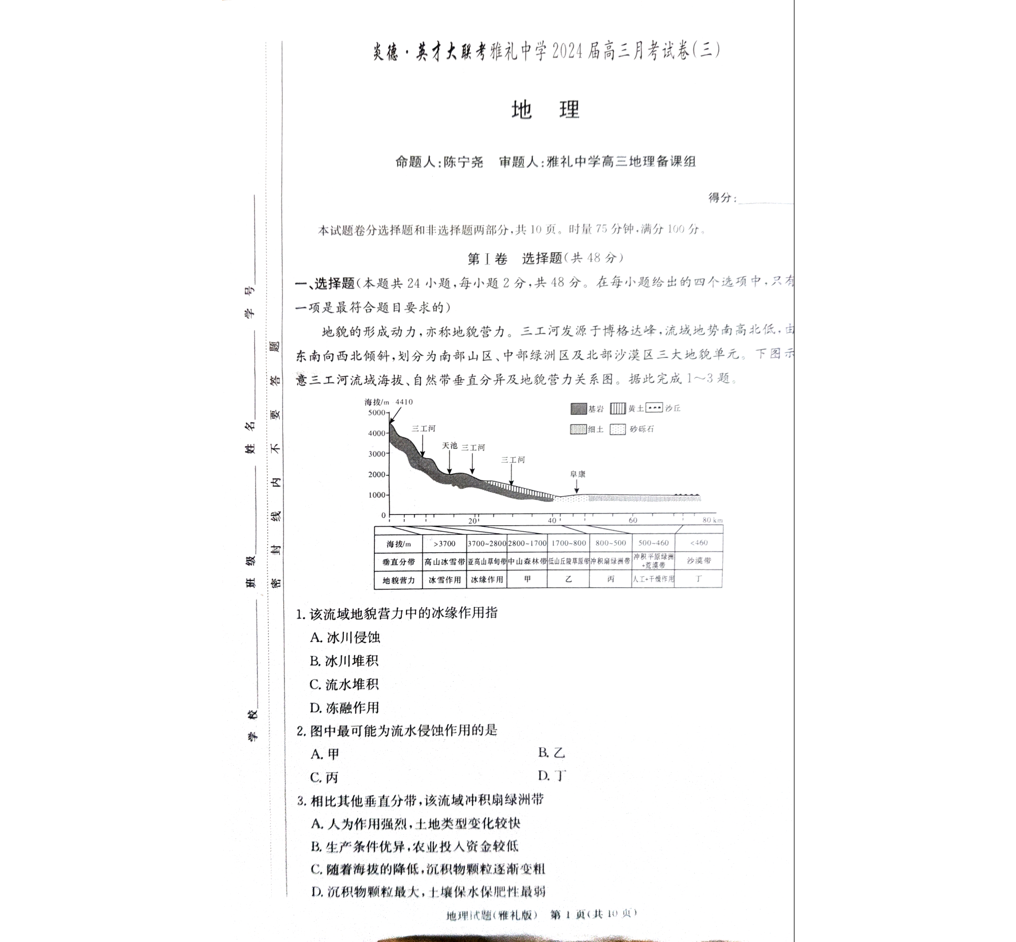 湖南省长沙市雅礼中学2024届高三上学期月考试题(三)地理