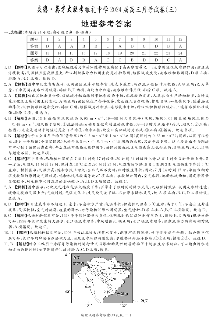 湖南省长沙市雅礼中学2024届高三上学期月考试题(三)地理答案